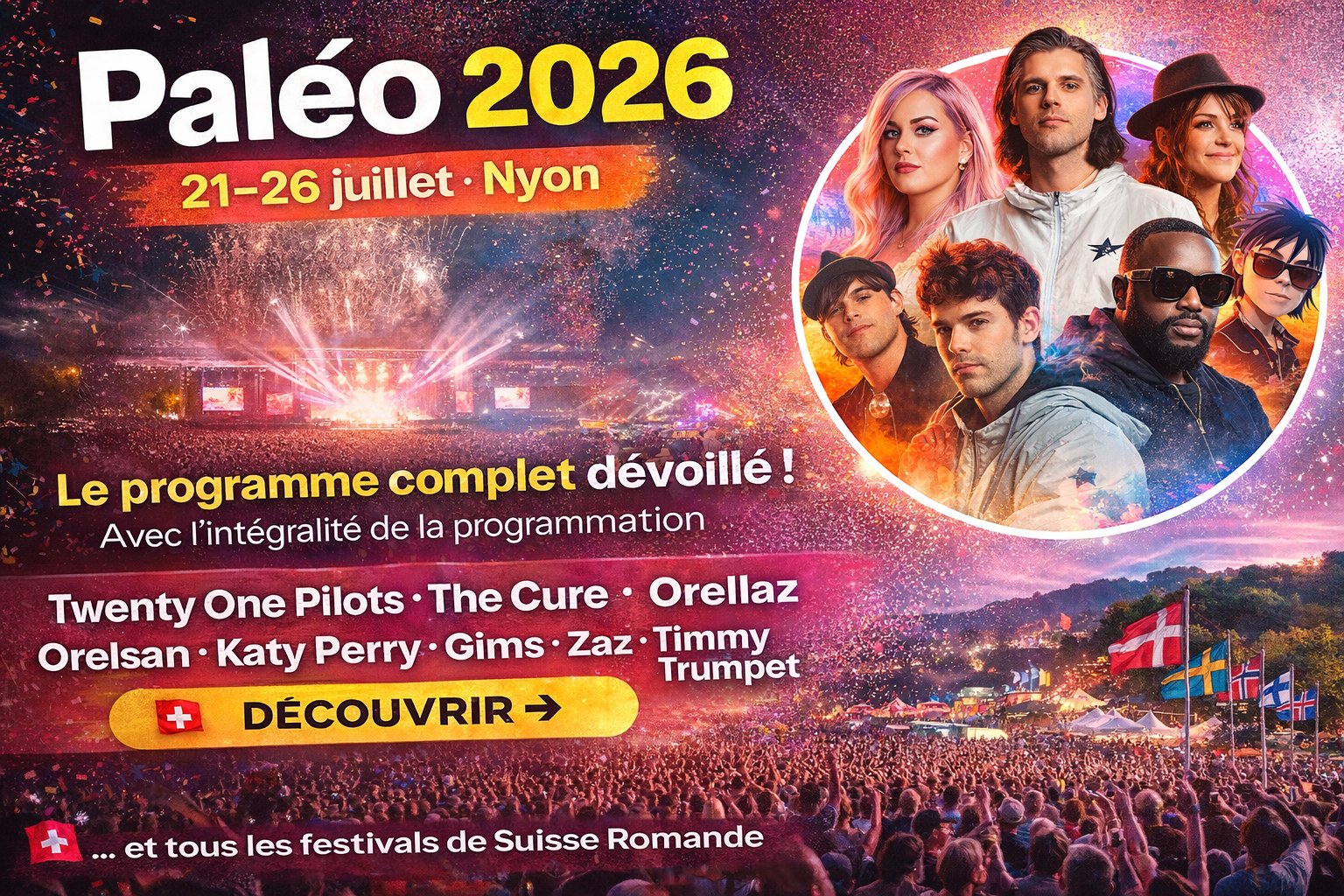 Du 21 au 26 juillet 2026 à Nyon, le Paléo Festival revient avec des artistes internationaux, des découvertes pointues et une ambiance unique qui attire chaque année des dizaines de milliers de festivaliers.